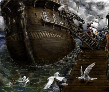 La passeggiata sul molo li porta invece in prossimità della Verconnes mentre il primo chiarore illumina l’orizzonte ad est. Il mercantile battente bandiera di Arx è ben sorvegliato, cosa del resto piuttosto normale. Cinque figuri armati, tra cui un nerboruto e poco rassicurante mezzorco, sono posti a guardia della nave.
